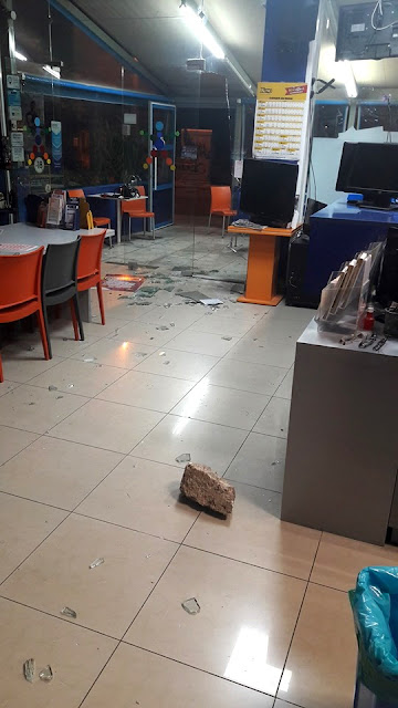 Άγνωστοι έσπασαν την τζαμαρία του πρακτορείου με μια μεγάλη πέτρα τα ξημερώματα της Τετάρτης 31/7/19.