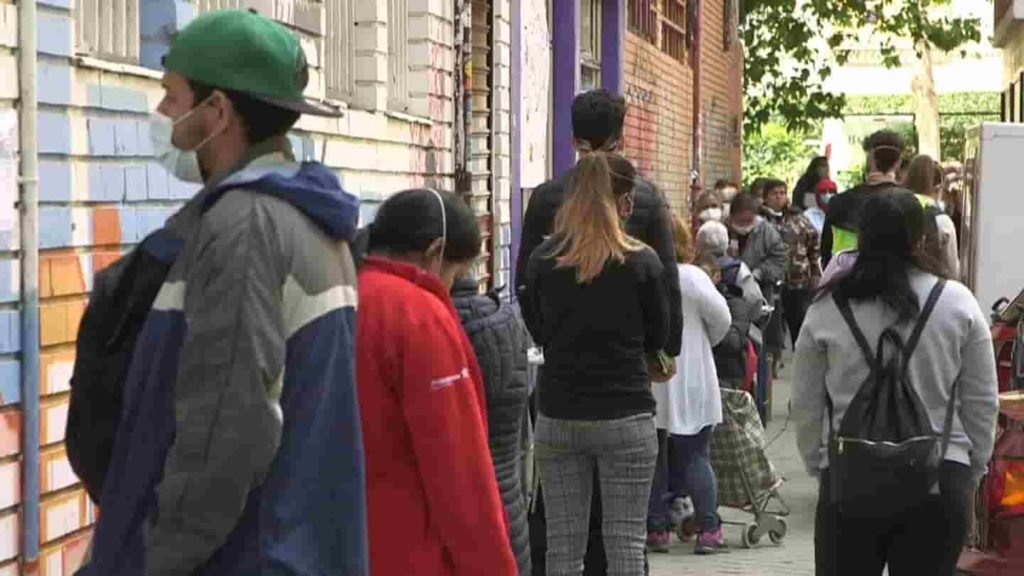 Έξω από την εκκλησία Σάντα Μαρία Μικαέλα και Σαν Ενρίκε, η οποία χρησιμοποιείται ως κέντρο διανομής της τράπεζας τροφίμων, γυναίκες σχηματίζουν ουρές για να παραλάβουν τις ημερήσιες προμήθειες που δικαιούνται, ψωμί, γάλα και πάνες.