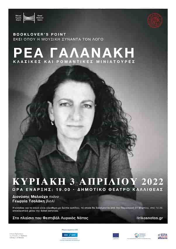 Στο πλαίσιο των εκδηλώσεων της σειράς Booklover’s Point του Φεστιβάλ Λυρικός Νότος, που διοργανώνουν Σύνδεσμος Δήμων Νότιας Αττικής- Καλλιθέα, Παλαιό Φάληρο, Άλιμος (ΣυΔΝΑ) με την Εθνική Λυρική Σκηνή, παρουσιάζεται η διακεκριμένη συγγραφέας Ρέα Γαλανάκη στο Δημοτικό Θέατρο Καλλιθέας, την Κυριακή 3 Απριλίου, στις 7 το απόγευμα.